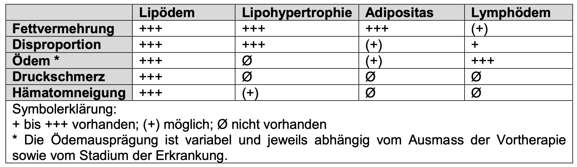 Für die Unterscheidung von Lipödem, Lipohyperplasie und Adipositas kann die folgende Tabelle helfen: